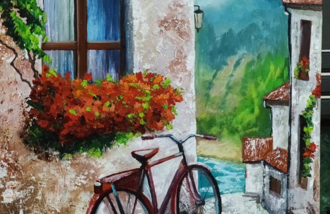 A quiet cobblestone corner where a bicycle pauses beneath blooming windows, this painting captures a moment suspended between movement and stillness. Soft light, warm textures, and distant hills evoke nostalgia, inviting the viewer to linger in a place where life moves gently and unhurried.