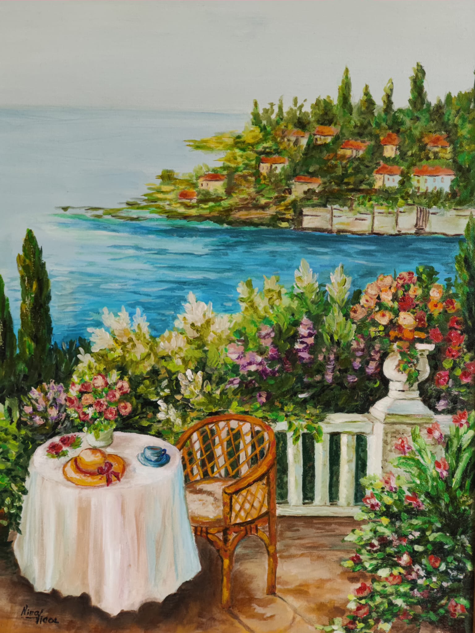A sunlit terrace overlooking tranquil blue waters, where blossoms spill over the balustrade and a simple table awaits a peaceful moment. The scene captures a gentle pause—where nature, light, and stillness meet in quiet harmony.