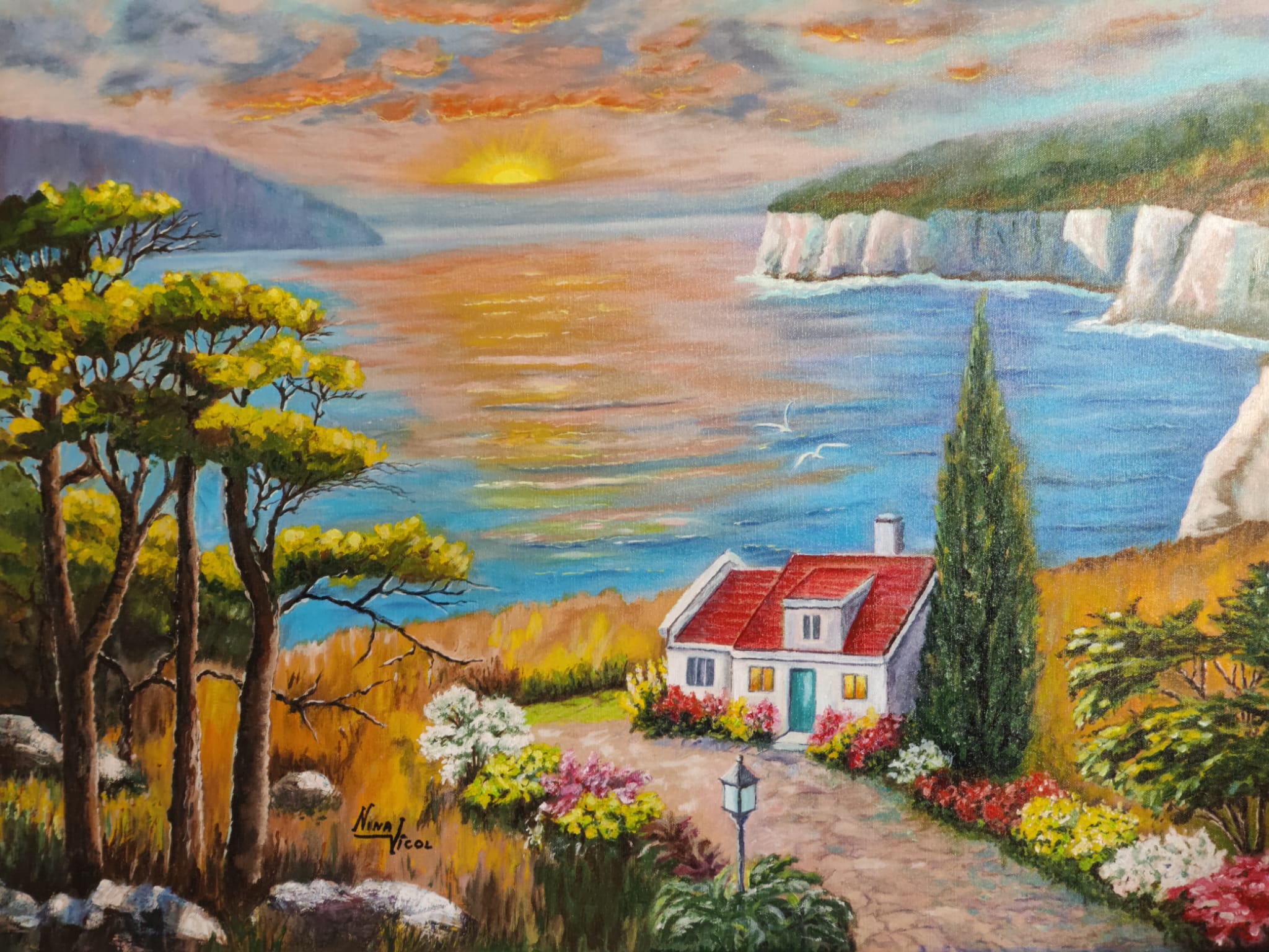 A quiet coastal refuge bathed in the last gold of day, where sea and sky dissolve into one luminous breath. The small house, nestled among wind-shaped trees and flowering paths, becomes a vessel of stillness—an intimate place where time softens, and light lingers just a moment longer.